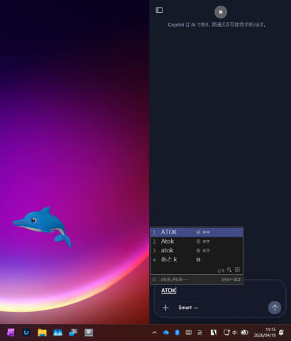 ATOKで文字変換を行なっている状態でもカイルくんは表示できる。もちろん、Copilot Keyboardをアンインストールするとカイルくんも消える
