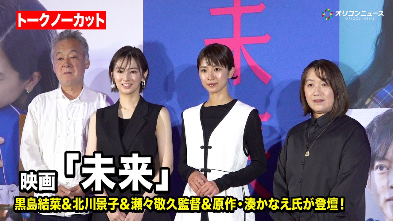 GIRLS 【ノーカット】黒島結菜&北川景子&原作・湊かなえ氏も登壇!映画『未来』公開直前プレミアムトークイベント 2026-04-23 【ノーカット】黒島結菜&北川景子&原作・湊かなえ氏も登壇!映画『未来』公開直前プレミアムトークイベント 俳優の黒島結菜、北川景子、監督の瀬々敬久氏、原作者の湊かなえ氏が都内で行われた映画『未来』公開直前プレミアムトークイベントに登壇した。 【関連動画】 ◆【ネタバレありノーカット】黒島結菜・松坂桃李・北川景子らキャストが集結! ◆北川景子、20年前は“暗黒期” ◆黒島結菜、俳優業&子育てに奮闘 #映画未来 #黒島結菜 #北川景子 #瀬々敬久 #湊かなえ