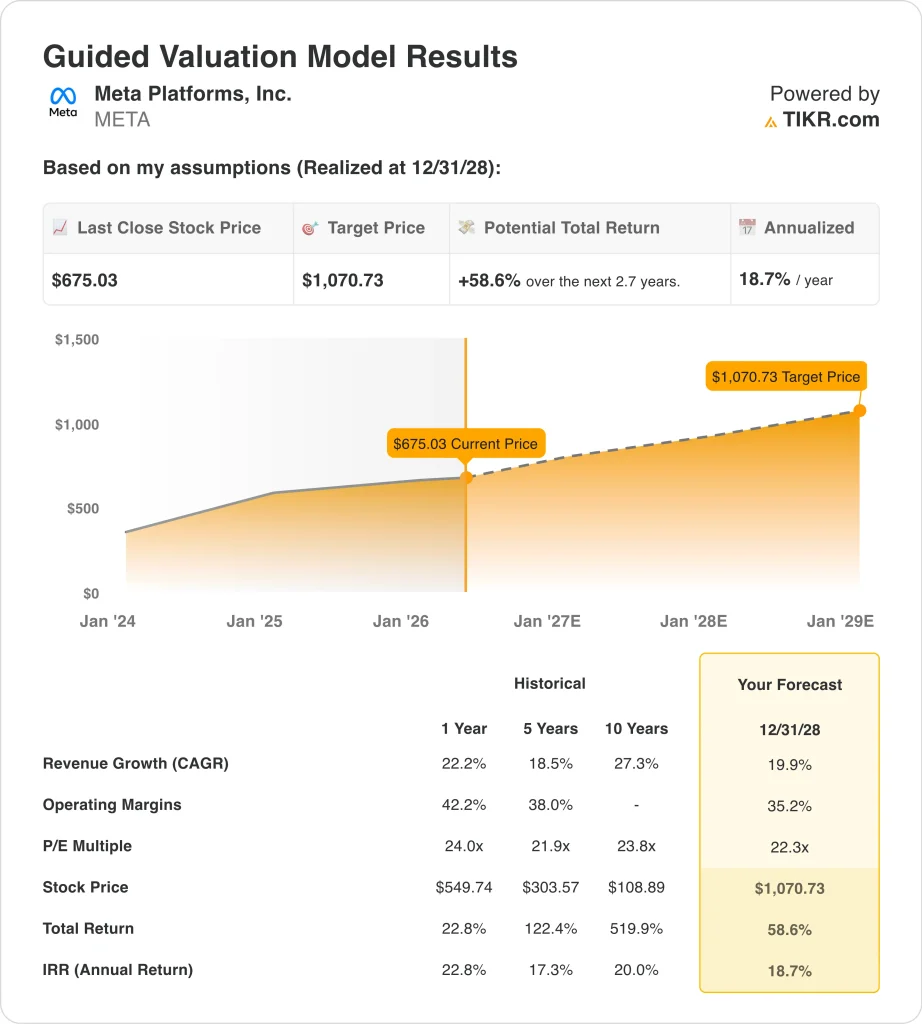 TIKRの新しいバリュエーション・モデル(無料)を使って、METAのようなお気に入りの銘柄を5年間のアナリスト予測で評価してみよう。