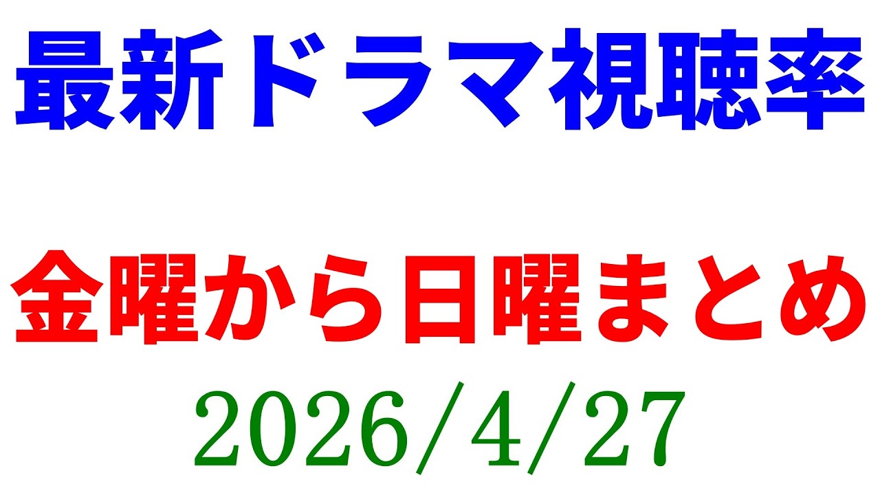 DRAMA 金曜~日曜 視聴率まとめ!視聴率速報☆2026年4月27日 2026-04-27 金曜~日曜 視聴率まとめ!視聴率速報☆2026年4月27日 ### ☆Amazon欲しいものリスト https://www.amazon.jp/hz/wishlist/ls/3MTQPTNTTWFUH?ref_=wl_share <ツイッター> https://twitter.com/KkReview このチャンネルのメンバーになって特典にアクセスしてください: https://www.youtube.com/channel/UC8I3iWxXV7Zqa5PpAeAlcFA/join