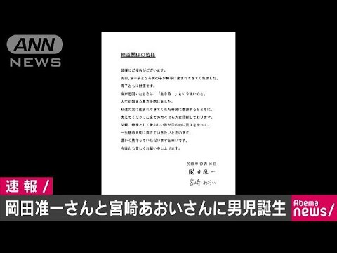 去年12月に結婚したV6の岡田准一さん(37)と、女優の宮崎あおいさん(32)が連名のファクスで第一子の男の子が誕生したと発表しました。 皆様にご報告がございます。先日、第一子となる男の子が無事に産まれてきてくれました。母子ともに健康です。 ・・・記事の続き、その他のニュースはコチラから! [テレ朝news] ANNTV ASAHItvasahiV6Videoテレビ朝日テレ朝ニュースファクス女優宮崎あおい岡田准一岡田准一さん宮崎あおいさん夫妻に男児が誕生181016本編のみ池谷麻依発表誕生