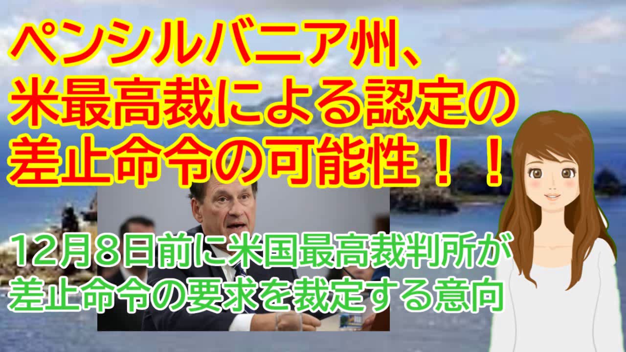 ペンシルバニア州、米最高裁による認定の差止命令の可能性!!12月8日前に米国最高裁判所が差止命令の要求を裁定する意向