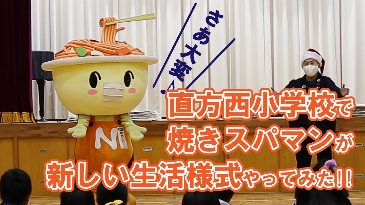 直方市のゆるキャラ「直方焼きスパマン」と直方市役所のおじさんが、直方西小学校を訪れて、「新しい生活様式」ダンスを踊ったよ。みんなも、新型コロナウイルスからキミとキミの大切な人を守るために「新しい生活様式」をやってみよう。