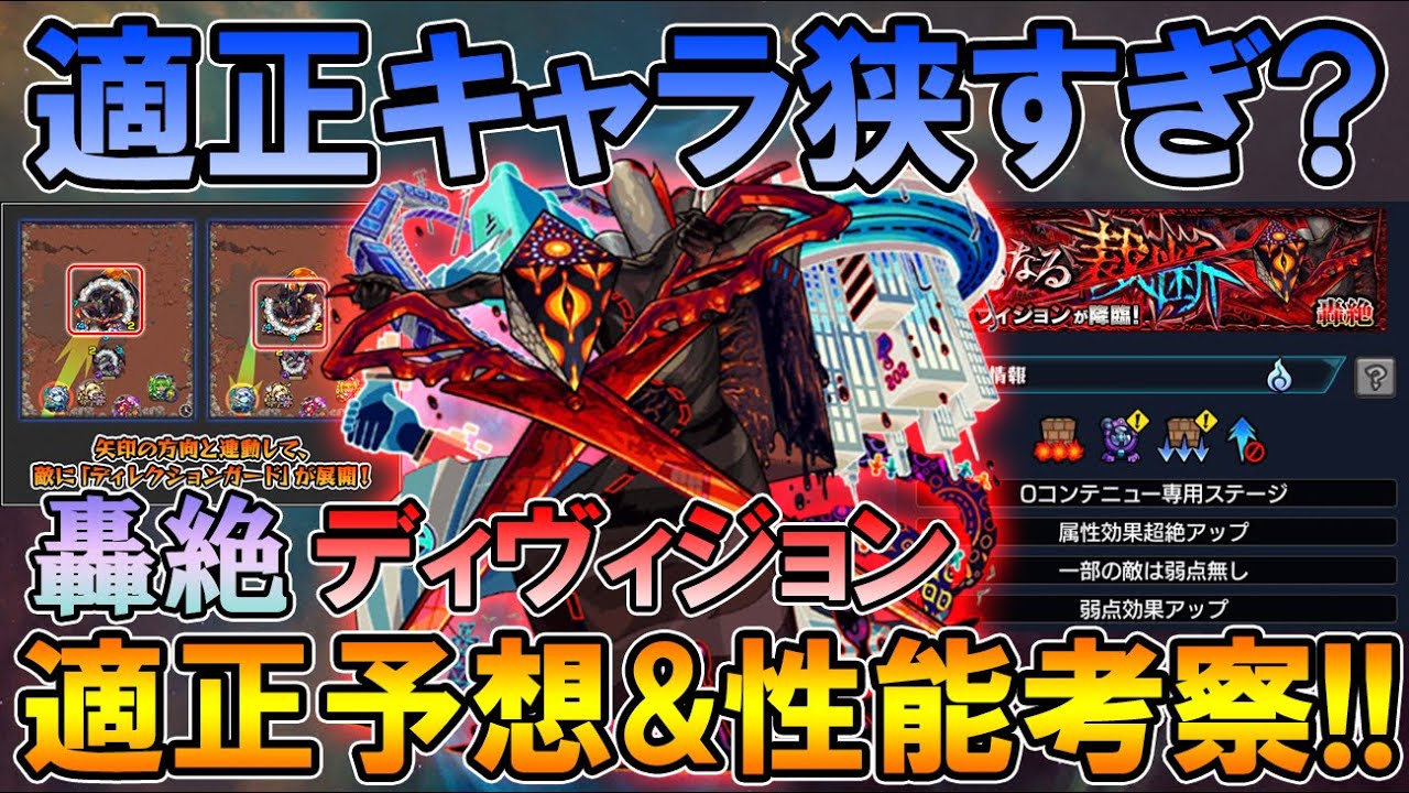 今回は1/2に新降臨する轟絶の「ディヴィジョン」のギミックと性能が判明したので、新ギミック「ディレクションガード」の解説や事前の不具合、適正キャラをガチャ限と降臨(運枠)に分けて紹介、自分の初見PT、事前にすべきこと、性能考察と運極にすべきかについて細かく話していきます!