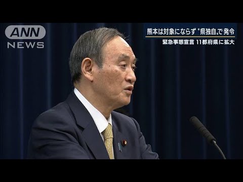 新型コロナウイルスの感染拡大を受け、政府は13日、新たに栃木・愛知・岐阜・京都・大阪・兵庫・福岡の7府県に対して緊急事態宣言を出しました。これで対象地域は11の都府県に広がりました。