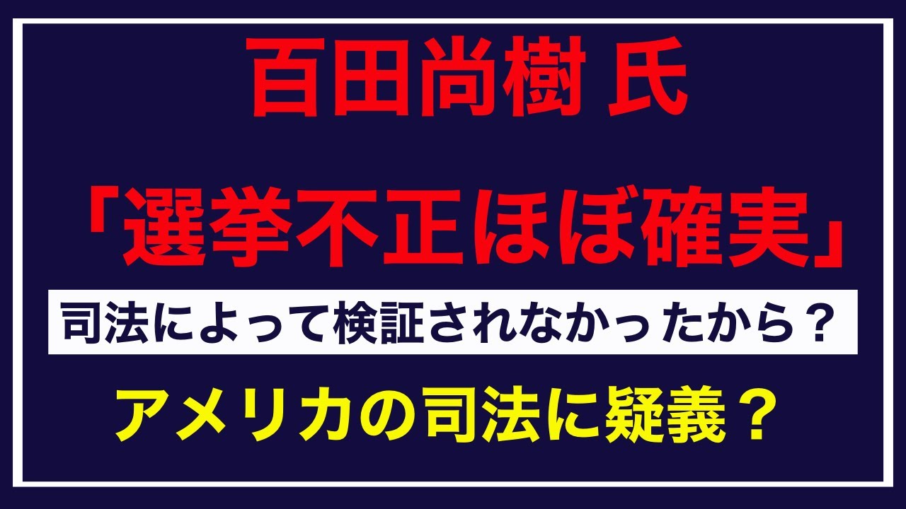 おはこんばんにちは。 NORI newsと申します。 ニュースを独自の解釈でまとめたものをお届けしています。引用先ツイッター 百田尚樹氏: ツイッターもどうぞ NewsTwitterVideoアメリカ大統領選挙ニュース不正選挙米大統領選挙で多くの州にまたがって不正が行われたことはほぼ確実アメリカの司法がそれを検証しないことをどう考えてる保守政治日本百田尚樹米国大統領選挙解説