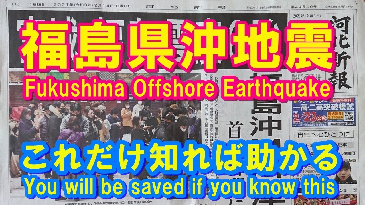 2021年2月13日23時8分に、福島県沖でM7.3、最大震度6強の地震が発生したが、この地震の前には様々な前兆現象が起きていた。このような前兆の種類を多く知ることによって、今後の大地震から自分や周囲の人々の命を守れるかもしれない。それらをまとめて、緊急で動画を公開する。