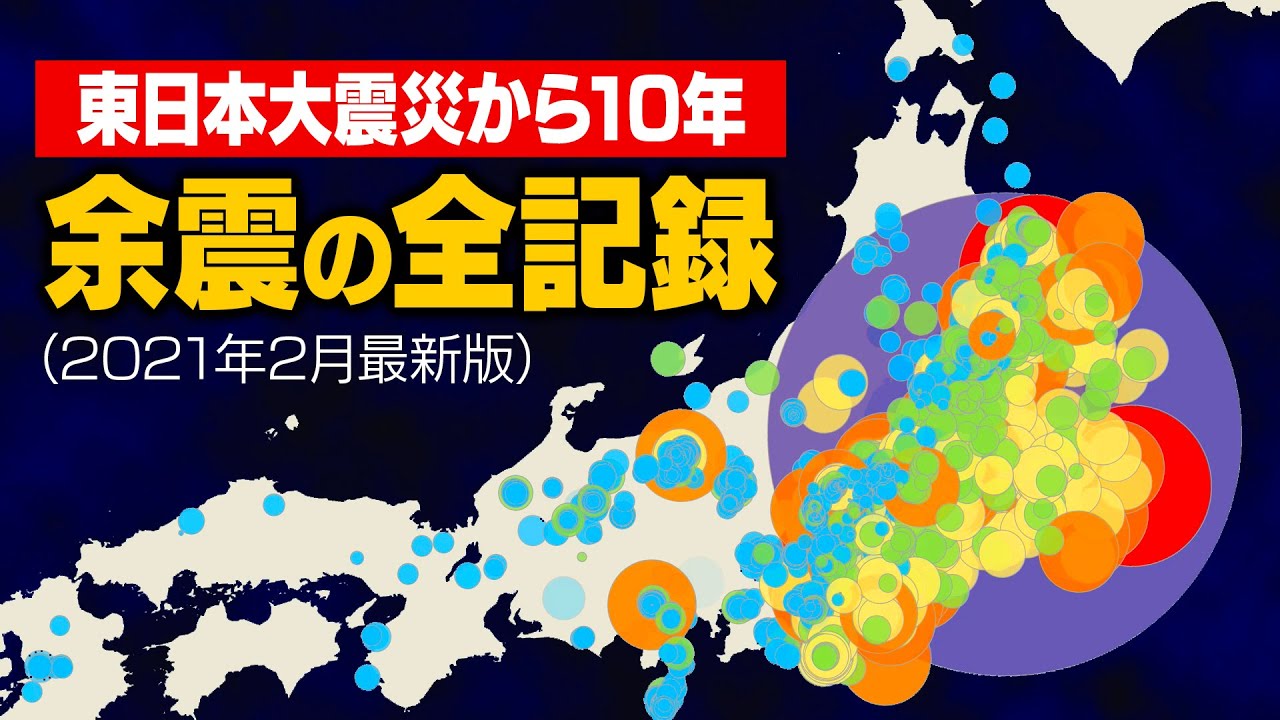 東日本大震災から10年になるのを前に、2011年3月9日から2021年2月17日までの地震を全て可視化してみました。3月9日の前震、3月11日の本震、そして現在にかけて続く余震。2021年2月13日には福島県沖を震源とするマグニチュード7.3、最大震度6強の大規模な余震があり被害も出ました。本震がマグニチュード9クラスだったため、余震は今後も少なくとも10年、場合によっては100年以上続いてもおかしくないと言われています。