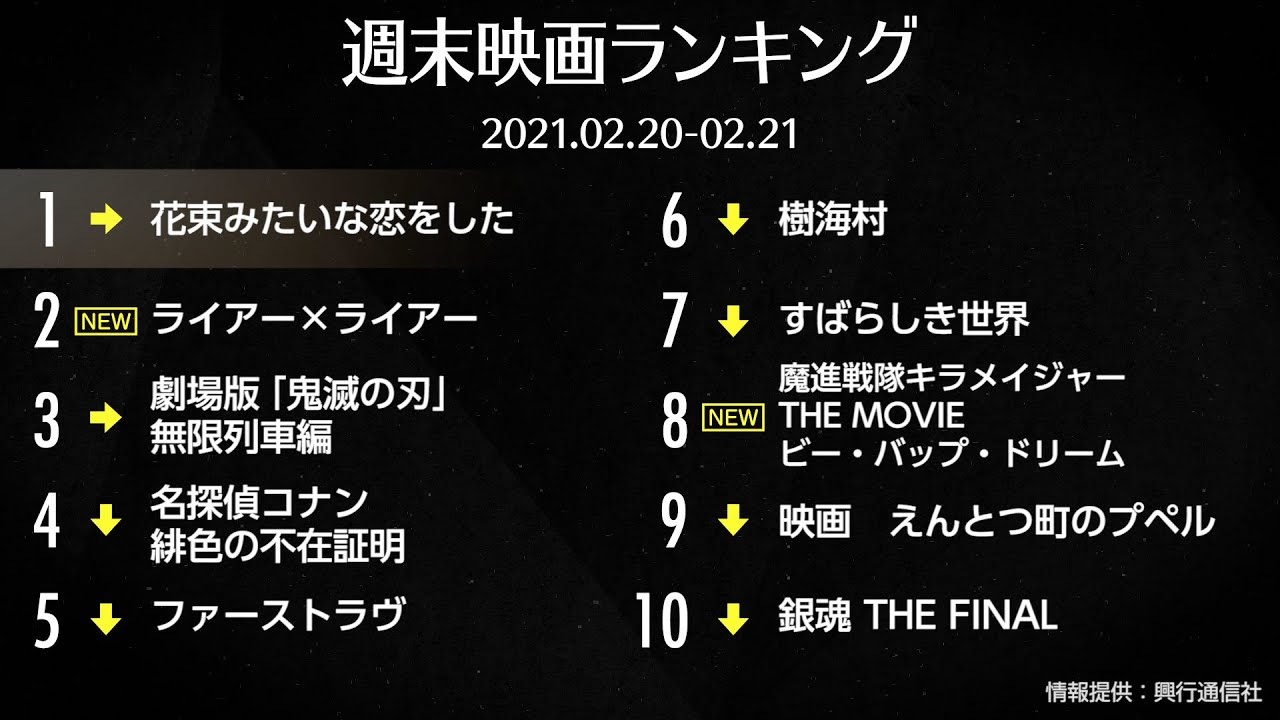 今週は、菅田将暉×有村架純『花束みたいな恋をした』がV4!『ライアー×ライアー』が初登場2位 そのほかの順位は以下の通り。週末の全国映画動員ランキング(興行通信社調べ) 2021.02.20-02.21 1位:『花束みたいな恋をした』2位:『ライアー×ライアー』3位:『劇場版「鬼滅の刃」無限列車編』4位:『名探偵コナン 緋色の不在証明』5位:『ファーストラヴ』トップ10はこちらから👇👇#花束みたいな恋をした #ライアーライアー #鬼滅の刃 DoNotTweetHideInMovieVideosNewsVideoはな恋4週連続1位ライアーライアーが初登場2位先週末の映画ランキング202102200221有村架純