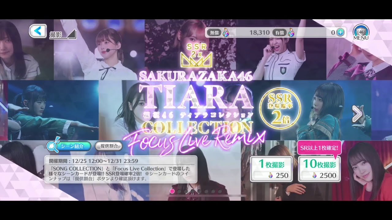 櫻坂46「TIARA COLLECTION Focus Live Remix」 2020/12/25〜31開催 メモ:確率2倍に騙されてはいけないガチャ。最近は専ら鍵の為に引いている。ユニゾンエアー ユニエア 櫻坂46 欅坂46 日向坂46 けやき坂46 20連櫻坂46COLLECTIONFocusLIVENewsRemixユニゾンエアー音無しTiaraVideo櫻坂46