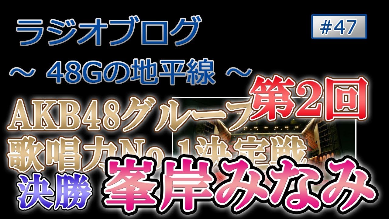 48Gの地平線 #47 第2回 AKB48グループ歌唱力No.1決定戦 決勝 峯岸みなみについて峯岸は永遠に卒業しなくていいので、ずっと、ずっと、AKB48を支え続けて欲しいと思います。 48Gの地平線AKB48グループ歌唱力No1決定戦峯岸みなみ決勝峯岸みなみ第2回