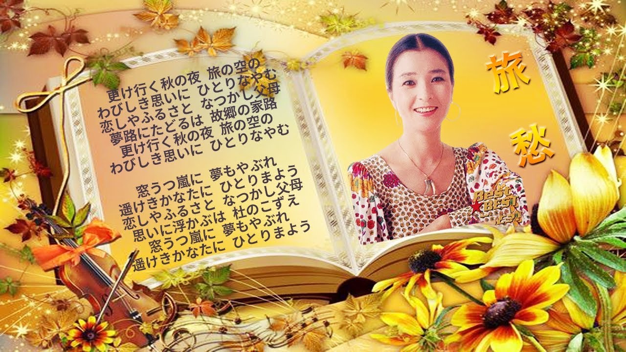 倍賞千恵子抒情歌全集 訳詩:犬童球溪 作曲:John P. Ordway 編曲:伊藤幹翁。 更け行く秋の夜 旅の空の わびしき思いに ひとりなやむ 恋しやふるさと なつかし父母 夢路にたどるは 故郷(さと)の家路 更け行く秋の夜 旅の空の わびしき思いに ひとりなやむ窓うつ嵐に 夢もやぶれ 遥けきかなたに ひとりまよう 恋しやふるさと なつかし父母 思いに浮かぶは 杜のこずえ 窓うつ嵐に 夢もやぶれ 遥けきかなたに ひとりまよう NewsVideo倍賞千恵子旅愁