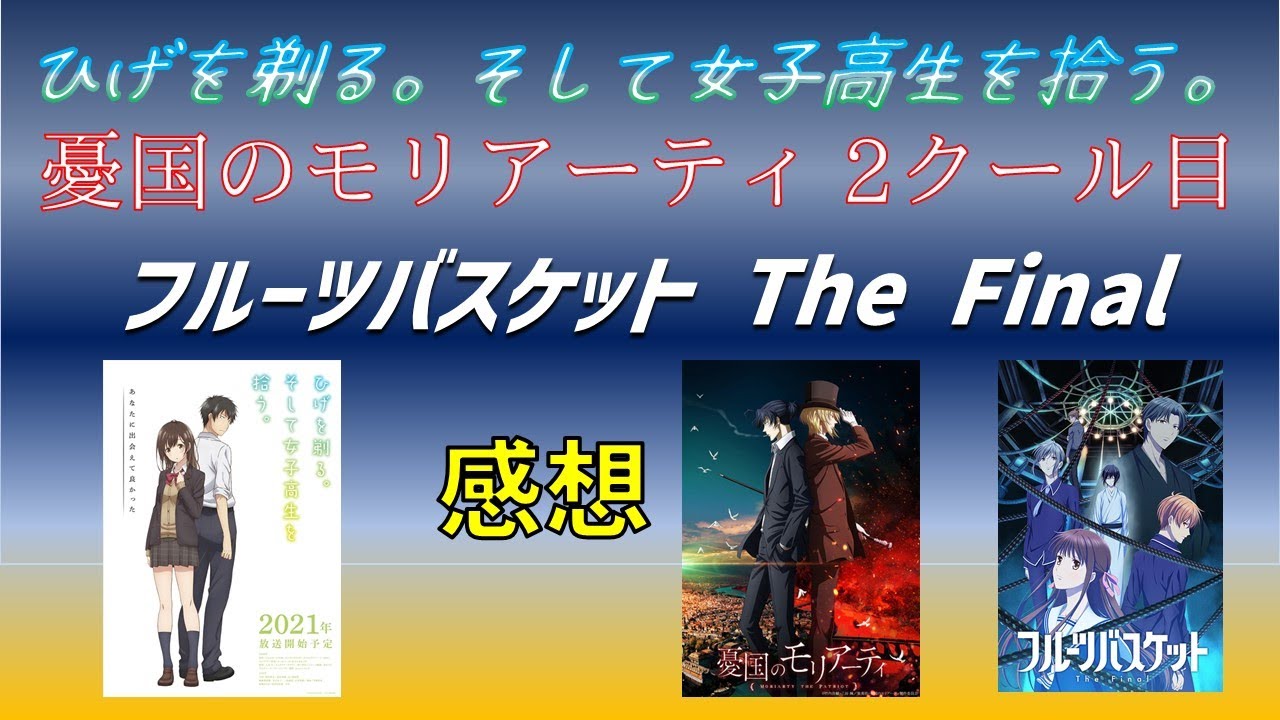 2021年春アニメ ひげを剃る。そして女子高生を拾う。 憂国のモリアーティ 2クール目 フルーツバスケット The Final 三作品の第一話の感想です。 【チャプター】 0:00 ひげを剃る。そして女子高生を拾う。 3:08 憂国のモリアーティ 2クール目 5:32 フルーツバスケット The Final 2021年春アニメ1話感想ひげを剃るそして女子高生を拾う憂国のモリアーティ2クール目フルーツバスケットanimeFinalTVアニメアニメ憂国のモリアーティ(2クール目)