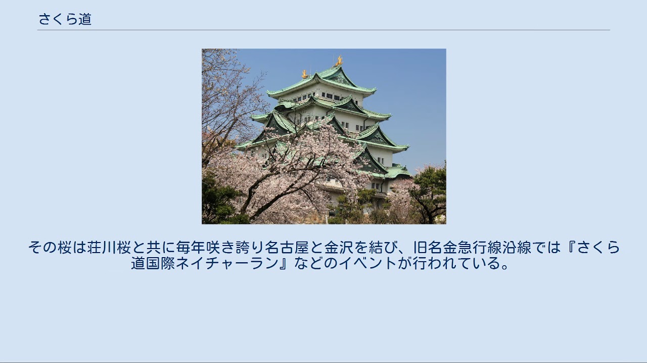 荘川桜(岐阜県高山市) さくら道(さくらみち)は、石川県金沢市から愛知県名古屋市までの国道の別名、および、それに取材した中村儀朋の小説。