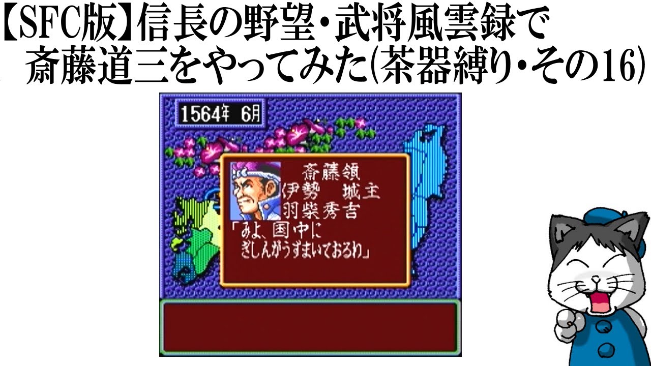 シナリオ1・実力編で斎藤道三を担当。いわゆる「茶器回し」を禁止(褒美として茶器を与えられるのは大名のみ、茶器の没収や購入は誰でもできる、調略の誘降に茶器を使うのは可能)した上で、がっつりと腰を据えて東国支配の大大名、そして征夷大将軍任命を目指す…がすでに将軍には任じられているので、残す姉小路家を外交努力で屈服させるべく、嫌がらせを続けながらじわじわと西進の日々。