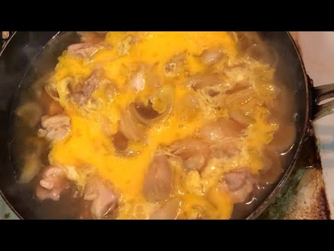 When cutting, if you cut it small, it will shrink and become smaller, so it will be larger. Cut in consideration of the balance between meat and skin. Cut a square or pentagon so that it is a reasonable size. I will make it with a frying pan. If you touch the frying pan and the meat directly, you may get burnt, so put an onion on the bottom of the pan and put the meat on it. Soy sauce, mirin, sugar and dashi are added, but we have used noodle soup for a long time. In actuality, add noodle soup, mirin, sugar, water, and Japanese-style dashi. The amount varies depending on how many times the noodle soup is concentrated. Use your favorite noodle soup. Cover and simmer for 10 minutes. Turn the egg with the fire on. Mix when it is a little hardened. After that, it ’s ready to cook. If you increase the amount of “egg”, you can eat as “egg binding”. It ’s a hot rice with “# Oyakodon”. It is a cheap and full menu when you have a full-fledged child.