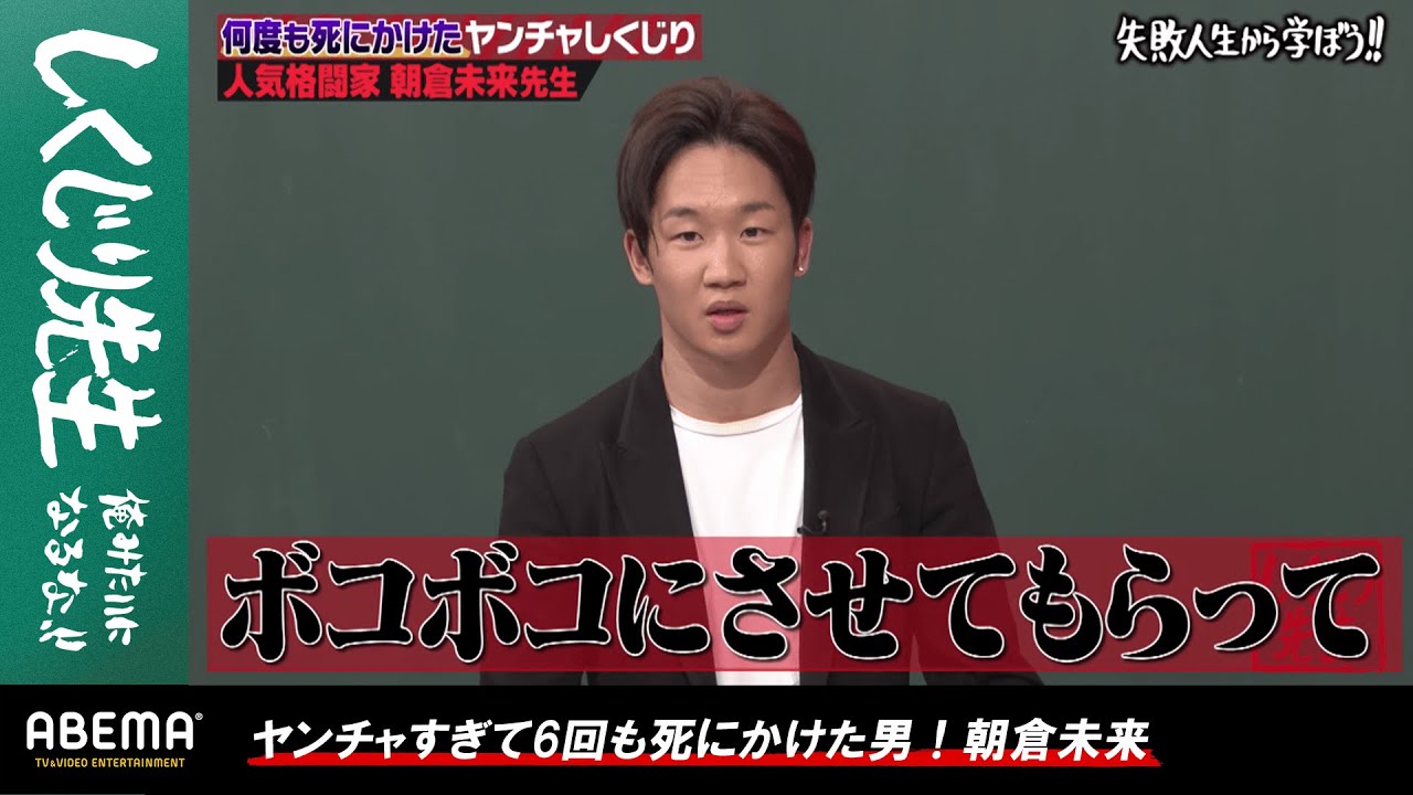 最初のYouTuber先生は格闘家の朝倉未来が登壇!ヤンチャをし過ぎて、6回死にかけた過去を衝撃告白します!幼少期に極真空手で全国2位、小学校のマラソン大会は常に優勝するなど自分のことを最強だと思っていた朝倉先生。中学生になると、さらなる刺激を求めて大勢の人たちと喧嘩。そして暴走行為が続き“逮捕”され、少年院で過ごすことになったと振り返ります。朝倉先生が自身の実体験をもとに、ヤンチャな人が陥りがちな危険ポイントを徹底解説。さらに朝倉先生が壮絶な人生から学んだ教訓を伝授します!お楽しみに!
