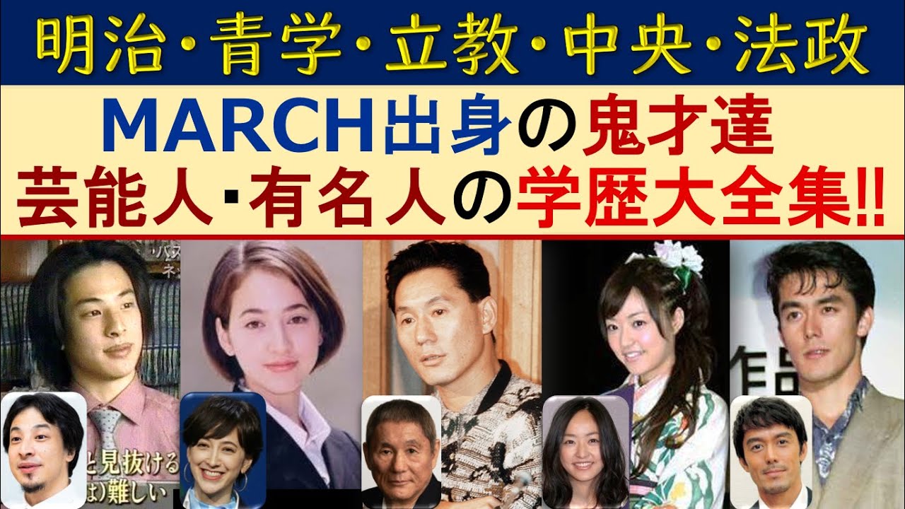 この動画では、大学群MARCH(マーチ:明治大学、青山学院大学、立教大学、中央大学、法政大学)出身の芸能人をご紹介しています。