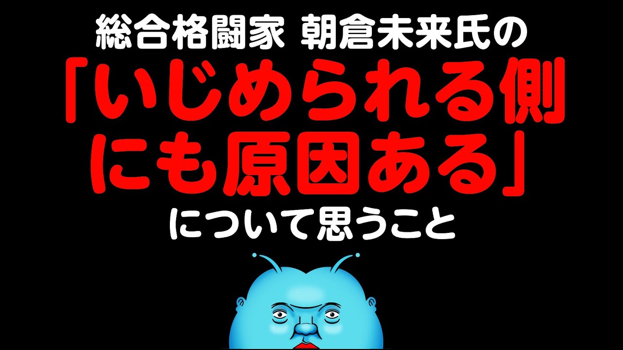 総合格闘家 朝倉未来氏のいじめ問題に対する考え方「いじめはいじめてるやつが100%悪い。でもいじめられる側にも原因はある」に賛否両論の声が起きてるみたい。