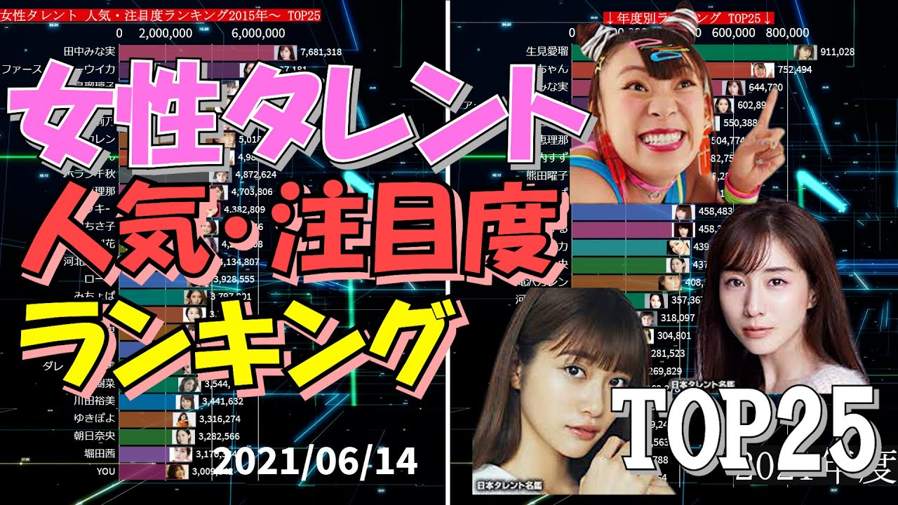 日本の女性タレントより、バラエティ番組などに多く出演しているタレントの人気・注目度のランキングを作成しました。データ取得日は2021年6月14日です。