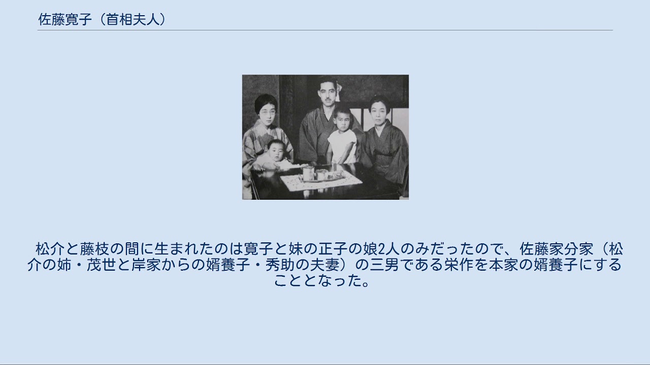 ^ 福井雄三『よみがえる松岡洋右 昭和史に葬られた男の真実』「第二章 青年松岡洋右、大陸へ雄飛」(PHP研究所、2016年) ^ 一方、佐藤家分家の次男で栄作の実兄である岸信介は、父の実家である岸家の伯父・信政の養子となり、信政の娘(つまり父方の従妹)良子と1919年(大正8年)に結婚していた。