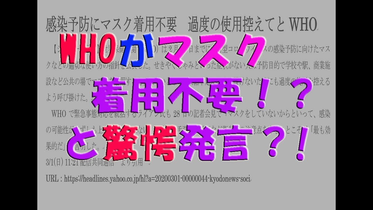 2020年3月1日、「感染予防にマスク着用不要 過度の使用控えてとWHO」と共同通信社から報道され、あたかもマスクは不要のように感じる報道・題名に驚かされた。マスクは完全ではないのはわかるが、感染者からのウイルス拡散を抑えたり、手から口を触ることなどでの感染抑止が期待できる。もちろん飛沫感染も。そういう意味でマスクは不要ではない。