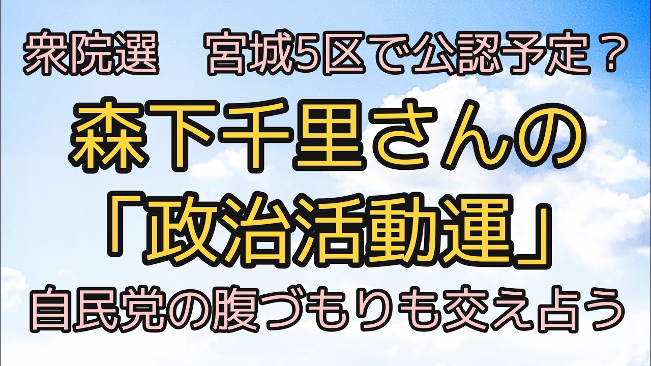 今年の衆院選を前に、自民党は元タレントの森下千里さんを宮城5区の公認候補とする方針、という報動がありました。公認について森下千里さんは言及をさけていますが、一方で「震災復興に強い思い入れがある」と公言なさっているのだそうです。自民党が森下さんを公認しようと考えている意図も含め、森下千里さんの運勢をタロットカードで占ってみました。あくまでも占いです。