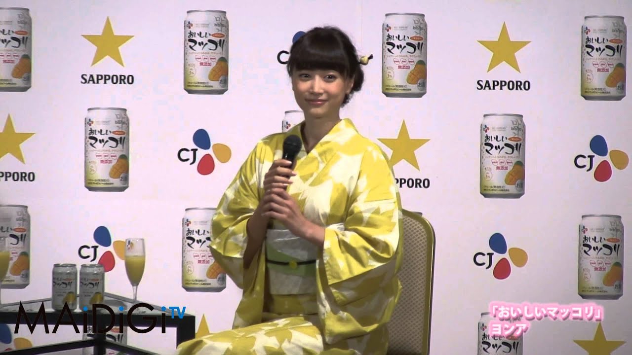 サッポロビールのフルーツマッコリ「CJおいしいマッコリ<ピンクグレープフルーツ>」の発表会見が行われ、同商品のCMに出演しているモデルのヨンアさんが登場しました。トークセッションの様子です。(毎日新聞デジタル) CJおいしいマッコリfoodogamantanトークセッションヨンア