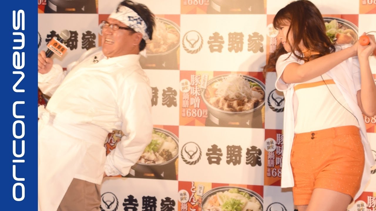 お笑い芸人のカンニング竹山、“神スイング”で話題のタレント・稲村亜美が吉野家『冬の定番・鍋膳』商品発表会に出席した。