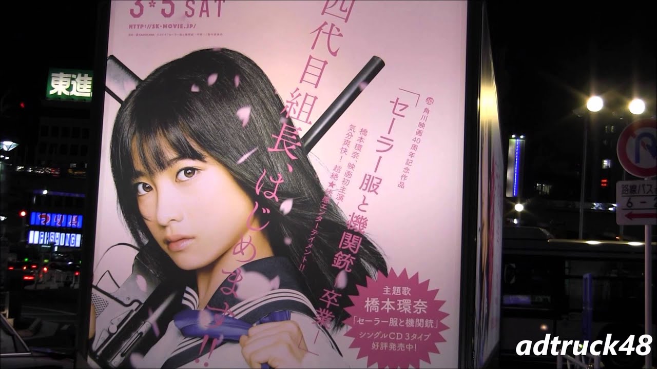 渋谷を走行する、Rev. from DVL 橋本環奈の初主演映画「セーラー服と機関銃-卒業-」宣伝トラックとコスプレしたマリオカート軍団。
