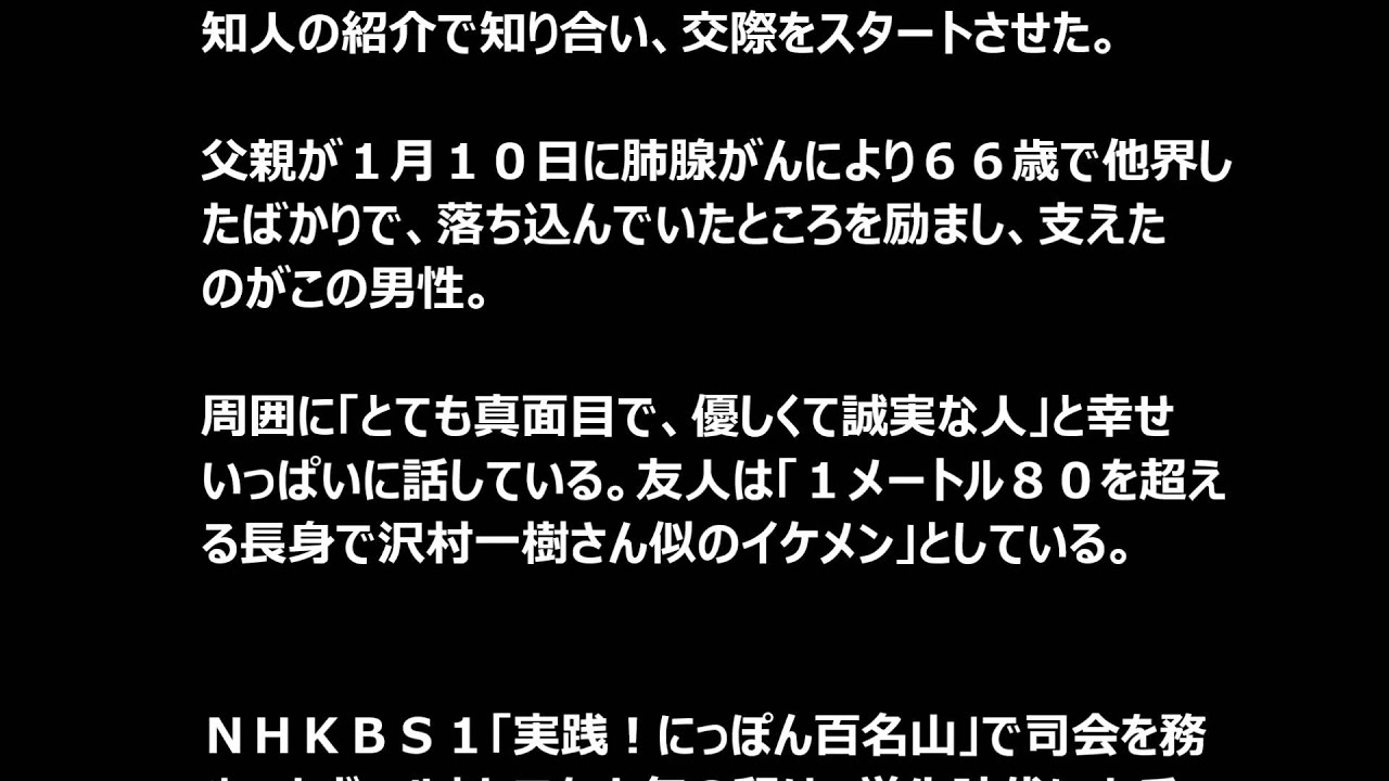 決め手は父と山だった。男性と出会ったのは今春。知人の紹介で知り合い、交際をスタートさせた。父親が1月10日に肺腺がんにより66歳で他界したばかりで、落ち込んでいたところを励まし、支えたのがこの男性。周囲に「とても真面目で、優しくて誠実な人」と幸せいっぱいに話している。友人は「1メートル80を超える長身で沢村一樹さん似のイケメン」としている。