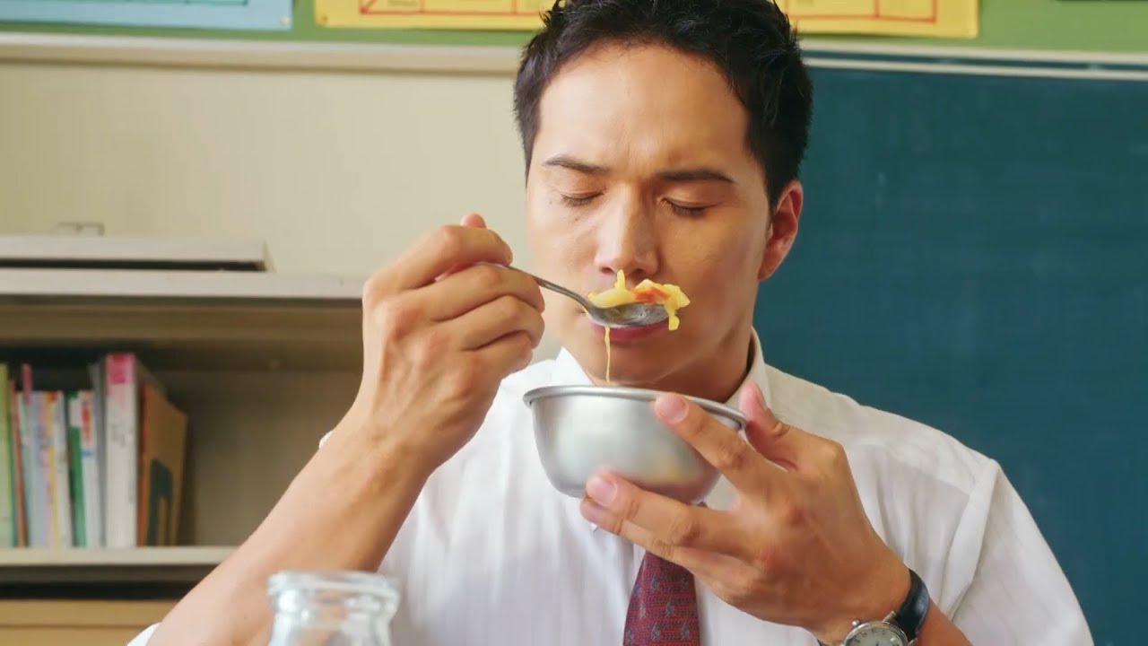 それに加えて衝撃的な甘利田のリアクションを、市原と綾部監督が笑いながら何度も試しているシーンや甘利田について語る映像、そして少し前まで学生だった武田の好きな給食などを笑顔で語るシーン、さらに給食マニアの神野を演じる佐藤が給食を食べるうえで大事にしていたことを語る。