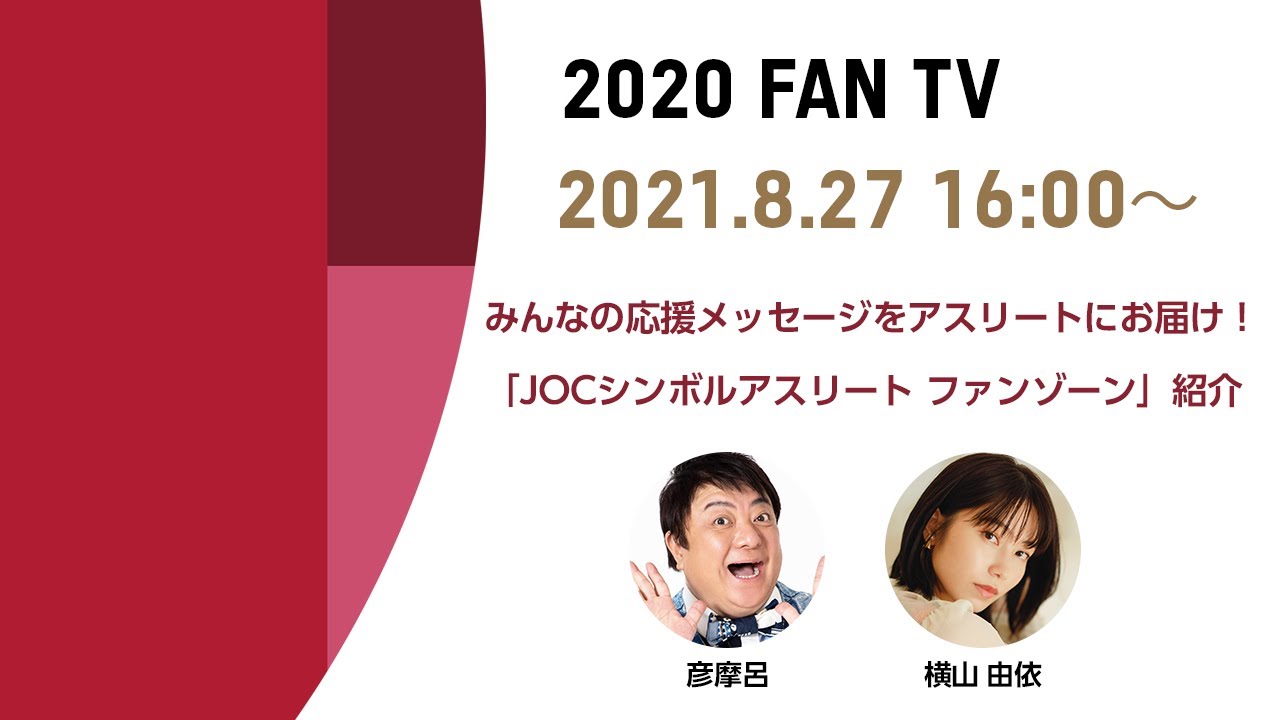 東京2020大会をもっと楽しむ配信番組「2020 FAN TV」、4日目(8/27)はアスリートたちにスポットを当てて紹介します。JOCシンボルアスリート ファンゾーンでは、今大会はもちろん、過去大会で活躍したアスリートたちの驚異の身体能力や、ここだけで明かされる選手の情報まで様々なコンテンツでアスリートたちを深く知ることができます。アスリートへの応援メッセージを寄せるコーナーでは、ゲストの彦摩呂さんとMCの横山由依さんにも、応援メッセージを書いていただきます。