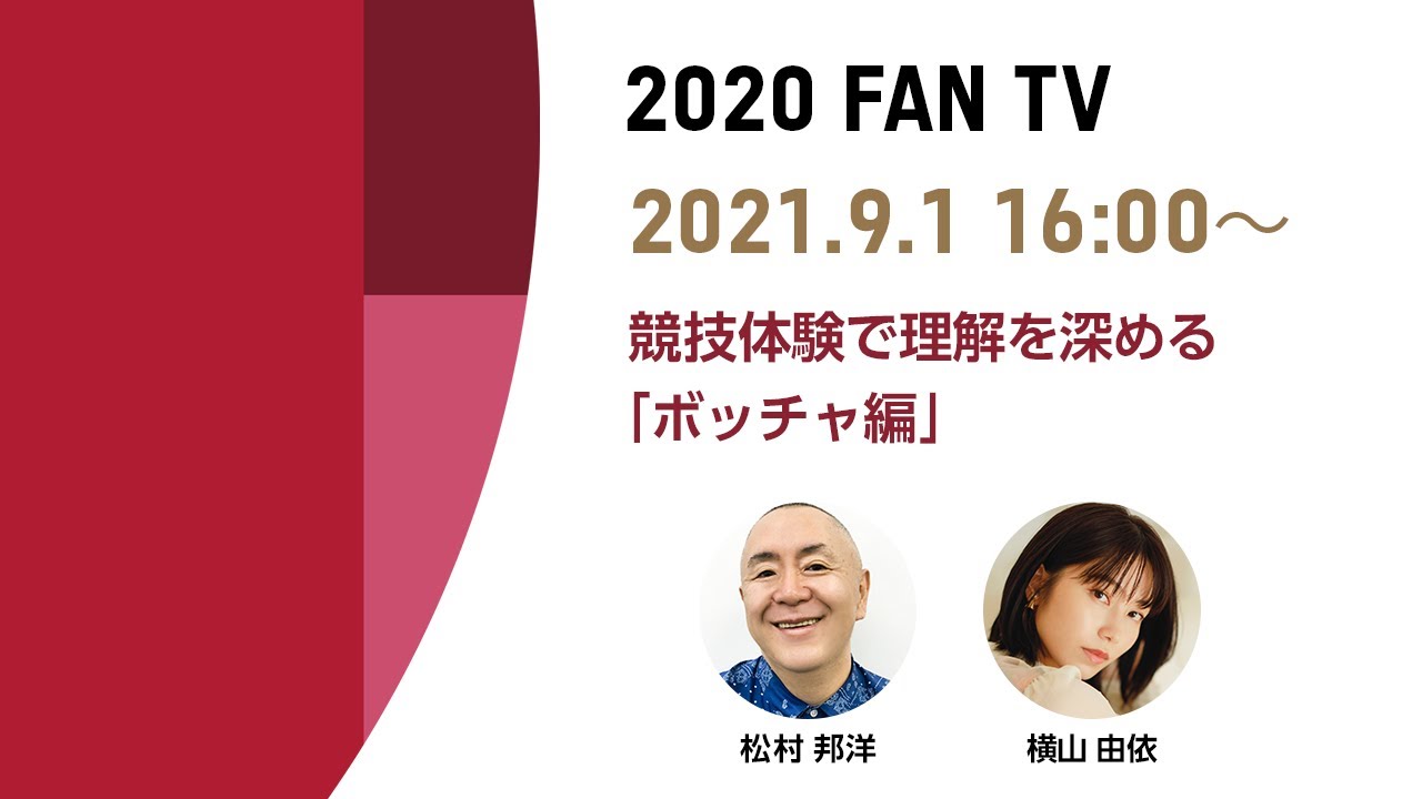 [配信開始は 5:04 から] 東京2020大会をもっと楽しむ配信番組「2020 FAN TV」、9日目(9/1)はパラリンピック競技の「ボッチャ」を紹介します。老若男女、障がいの有無にかかわらず誰でも一緒に、競い合える競技ボッチャはどのような競技なのでしょうか?日本ボッチャ協会の刀谷 誠さんに指導いただきながらゲストの松村邦洋さん、MCの横山由依さんと一緒に競技体験をしながらボッチャの魅力に迫ります。