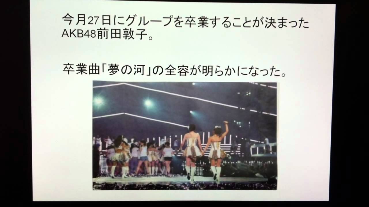 今月27日にグループを卒業することが決まったAKB48前田敦子。卒業曲「夢の河」の全容が明らかになった。 卒業曲「夢の河」は卒業公演直後に発売される27thシングル「ギンガムチェック」(29日発売)に収められる。曲を歌うのは、1期生の前田、その他のメンバーに篠田麻里子、大島優子らを加えた10人。 AKB大島ギンガムチェック前田前田敦子卒業曲夢の河大島優子小嶋陽菜峯岸みなみ松井珠理奈板野友美柏木由紀渡辺麻友篠田麻里子高橋みなみ