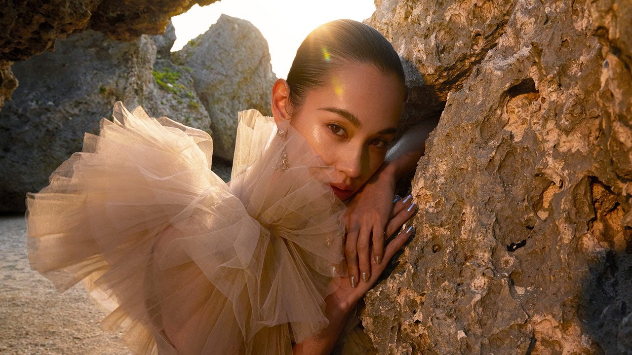 ビジュアルで水原さんは「RENU (レニュー)」と呼ばれるリサイクルポリエステルがあしらわれたワンショルダーのチュールトップ&黒のパンツスタイルで、リサイクルの真ちゅうや亜鉛でできたアクセサリーを身に着け、夕暮れ時の海辺で美スタイルを披露している。