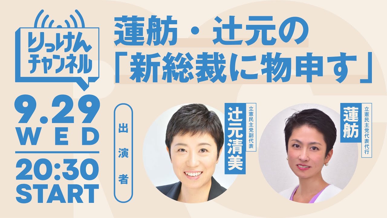 9月29日 20時半〜蓮舫・辻元清美の「新総裁に物申す」