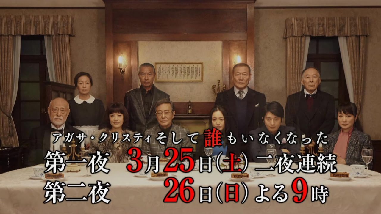 二夜連続ドラマスペシャル アガサ・クリスティ そして誰もいなくなった 第一夜 2017年3月25日(土)よる9時 第二夜 2017年3月26日(日)よる9時■番組サイト http://www.tv-asahi.co.jp/soshitedaremo/ミステリーの女王として名高いイギリスの女流作家、アガサ・クリスティの傑作推理小説『そして誰もいなくなった』が、ついに日本で初めて映像化!主演に仲間由紀恵を迎え、この春、テレビ朝日で二夜連続放送! アガサ・クリスティスペシャルそして誰もいなくなったテレビ朝日テレ朝ドラマ仲間由紀恵余 貴美子向井 理國村 隼大地真央柳葉敏郎橋爪 功沢村一樹津川雅彦渡瀬恒彦荒川良々藤 真利子