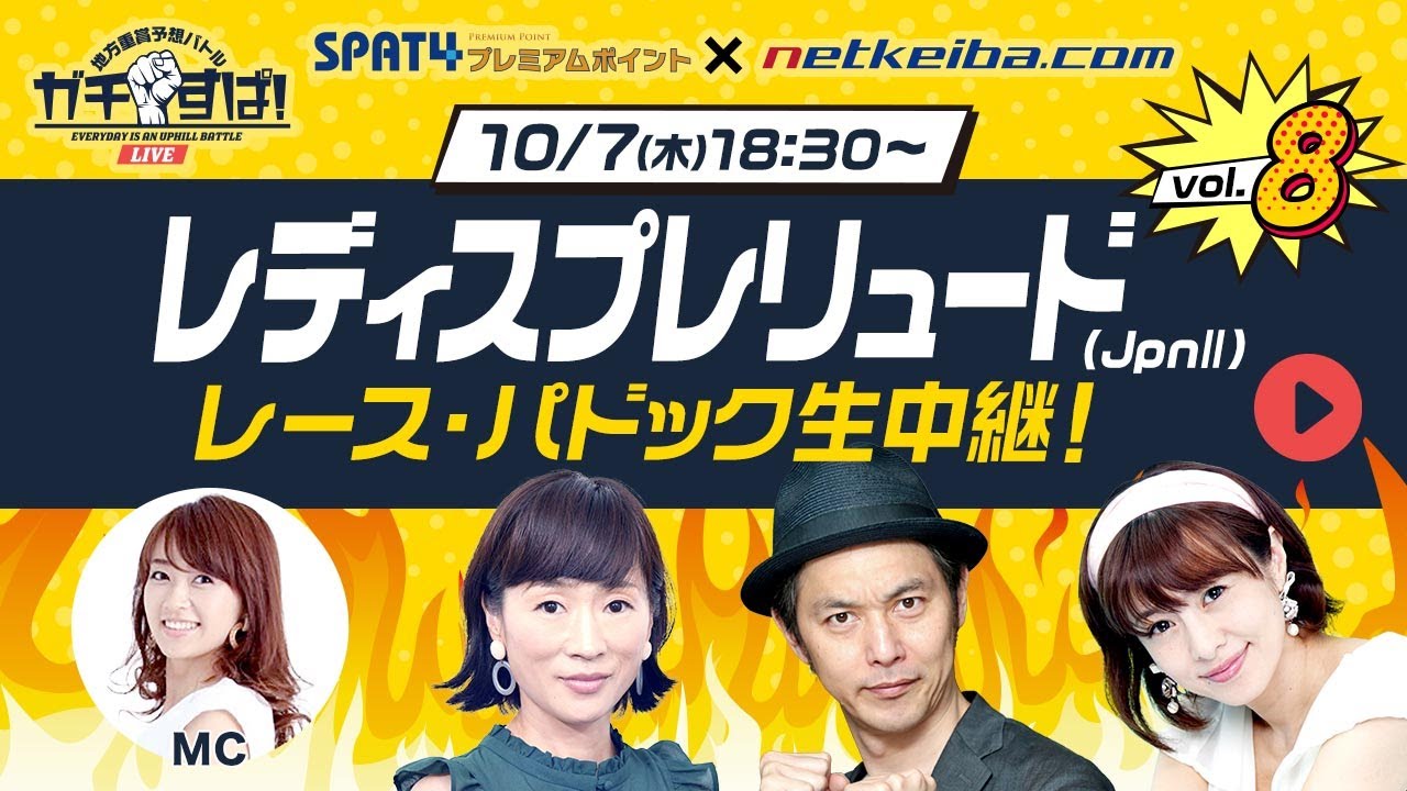 番組8回目の今回は、レディスプレリュードをガチ予想!レギュラーのキャプテン渡辺率いる男性チームと、細江純子&さとう珠緒のレディスチームが予想バトルを繰り広げる!さらに番組内でSPAT4プレミアムポイントからキャンペーンのお知らせも!