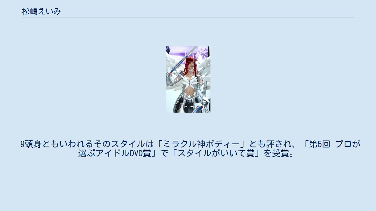 9頭身ともいわれるそのスタイルは「ミラクル神ボディー」とも評され、「第5回 プロが選ぶアイドルDVD賞」で「スタイルがいいで賞」を受賞。