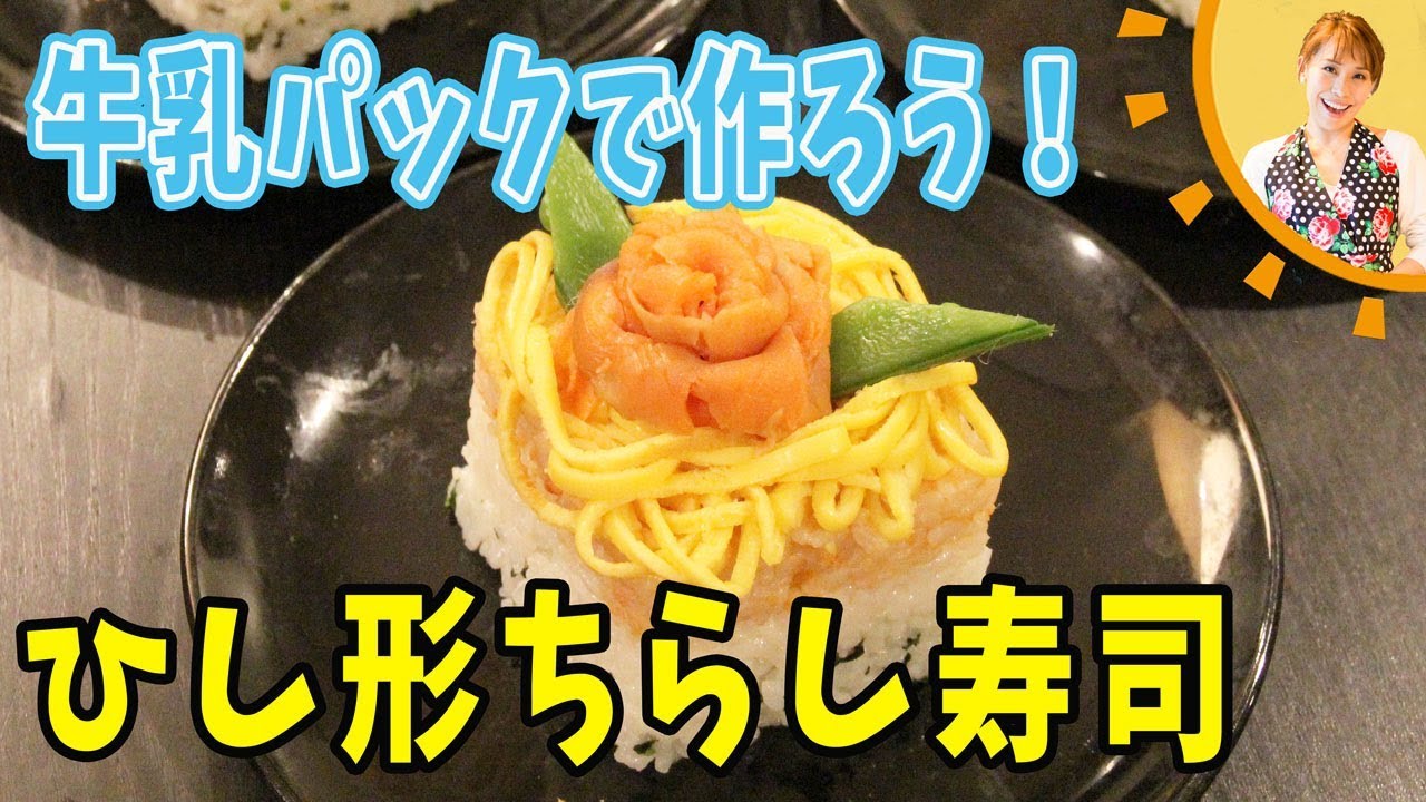 【4】 酢飯を型に入れる。【1】の型を盛り付け皿の上に置き、型の中に、わかめ、酢飯、鮭の順に入れ、そのつどスプーンで端っこまで押し固める。型に入れたまま常温で10分ほど置き、テープを外してゆっくりと牛乳パックを外す。