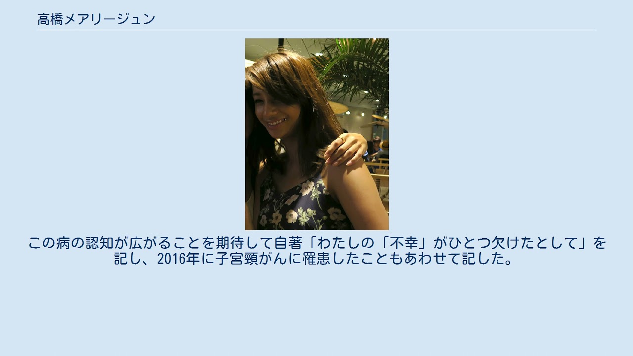 この病の認知が広がることを期待して自著「わたしの「不幸」がひとつ欠けたとして」を記し、2016年に子宮頸がんに罹患したこともあわせて記した。
