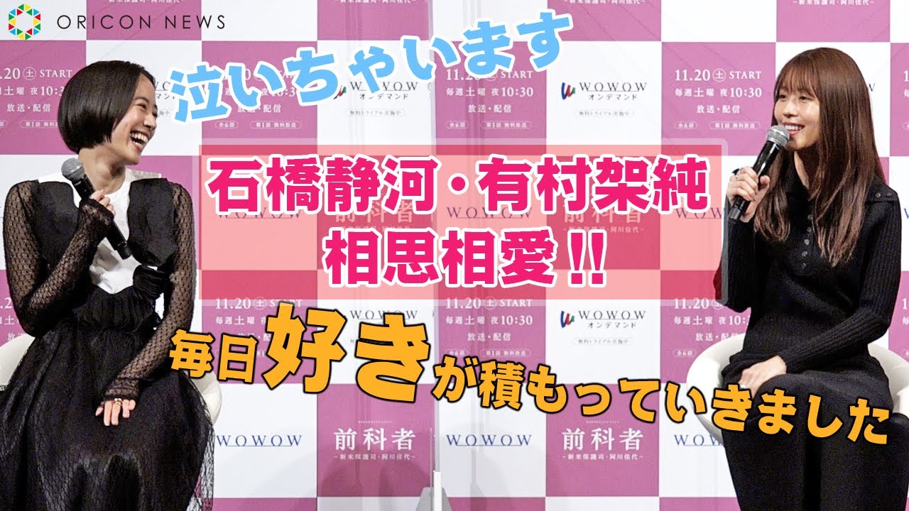女優の有村架純、石橋静河が19日、都内で行われたWOWOWオリジナルドラマ『前科者-新米保護司・阿川佳代-』(20日スタート、毎週土曜 後10:30、全6話※第1話のみ無料放送)完成報告会に出席。今回初共演となった2人だが、互いの印象を聞かれると、相思相愛っぷりをみせた。