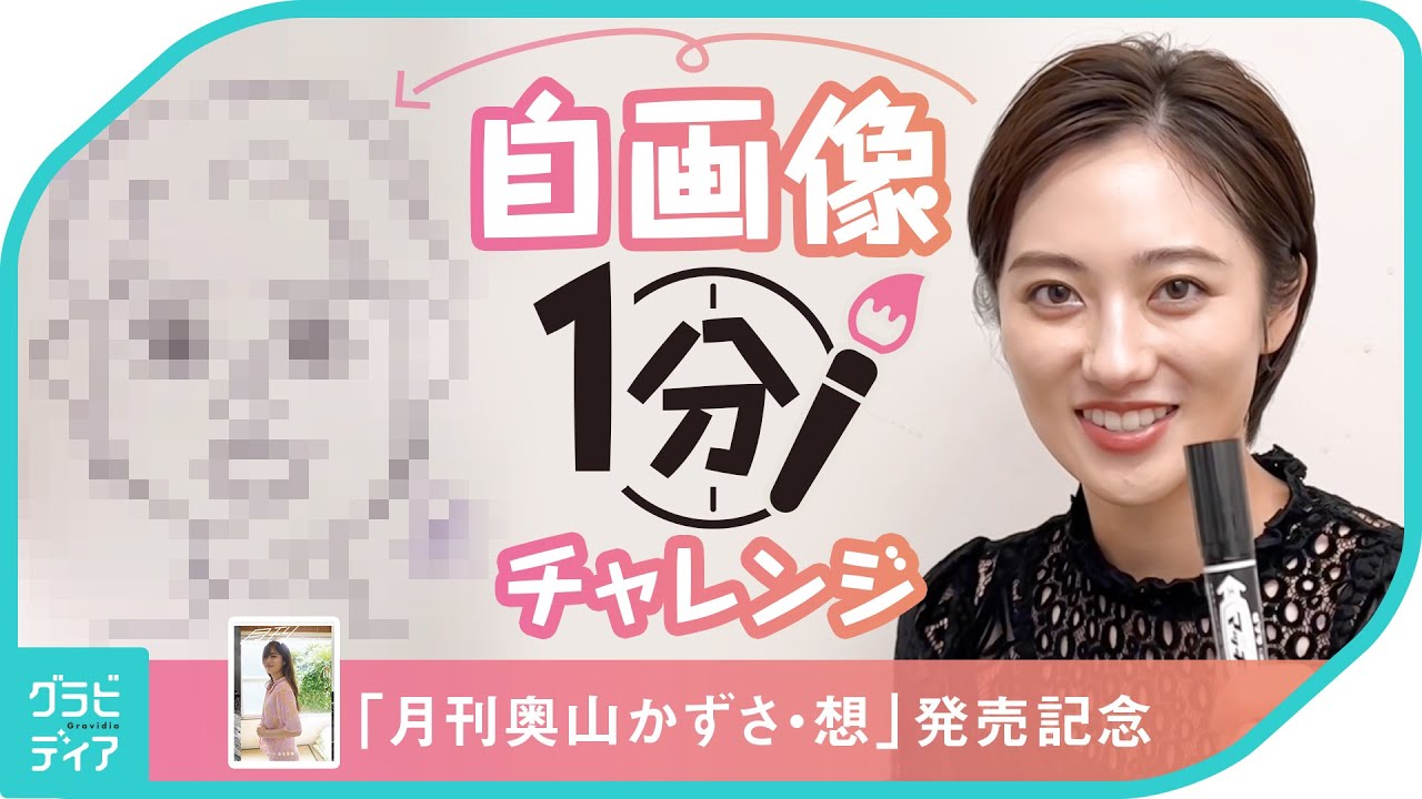 最高傑作写真集『月刊奧山かずさ・想』を発売した彼女が、自画像1分チャレンジにトライ!ロングヘアーをばっさりショートにしたかずさ。その特徴をとらえることが出来るのか!?「イラストを描くのは得意です!」と自信満々の彼女だが・・・衝撃の結末が待っていたーっ!!!?
