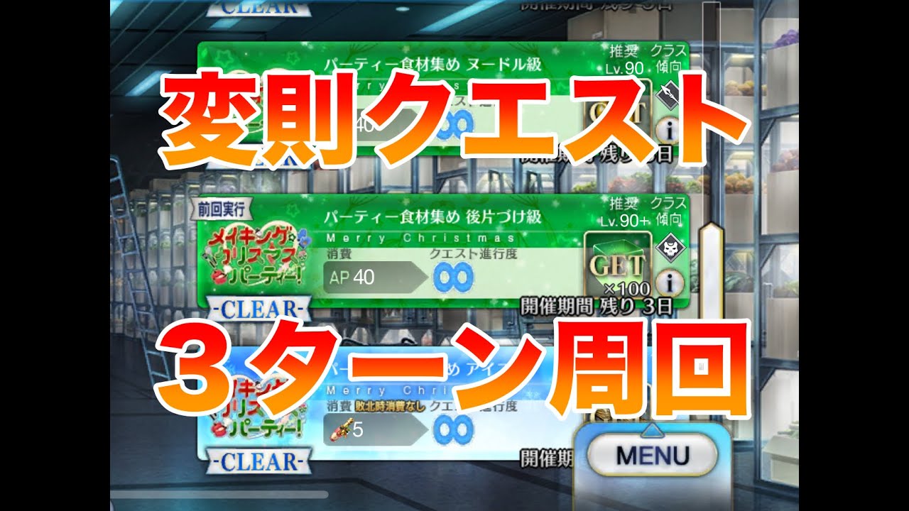 クリスマス2021(メイキング・クリスマス・パーティー!)・後片付け級(変則クエスト)を3ターン周回する編成を2つご紹介します。