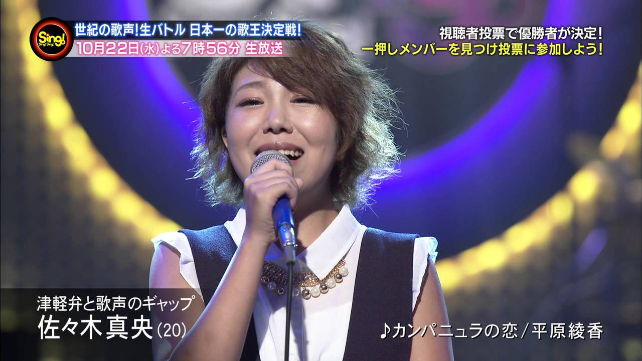「Sing!Sing!Sing!」【1st Season Finale】 10/22(水)夜7:56~TBS系全国15局で同時生放送! 視聴者リアルタイム投票で優勝者が決まる! 審査員は「あなた」です! 決勝戦のルール・視聴者投票の方法など詳しくは http://www.tbs.co.jp/singsingsing/final_sp/ Sing!Sing!Sing!TBSオーディション佐々木麻衣
