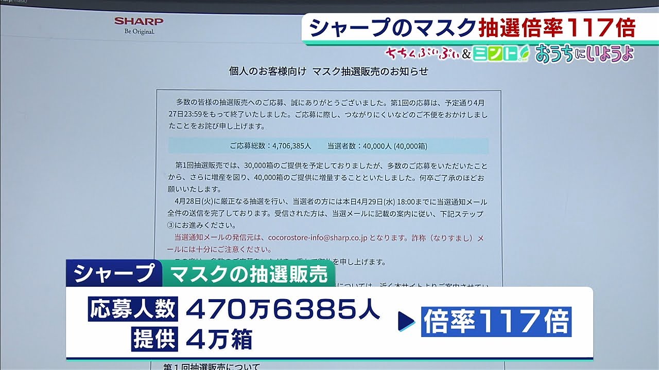 4月27日にウェブ上で行われた『シャープのマスク』の抽選販売。応募人数が470万6385人で、マスクの提供が4万箱だったことから、倍率が117倍となったことがわかりました。