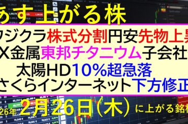MONEY 2026-02-25 フジクラ株式分割。円安で先物上昇。JX金属が東邦チタニウム子会社化。さくらインターネット下方修正。~あす上がる株 2026年2月26日(木)に上がる銘柄。最新の日本株情報。高配当株の株価やデイトレ情報フ…