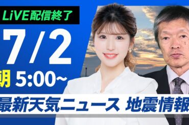 NEWS 2025-07-04 【ライブ配信終了】最新天気ニュース・地震情報 2025年7月4日(金)/西日本はうだるような暑さ 北日本は強雨に注意〈ウェザーニュースLiVEコーヒータイム・田辺 真南葉/山口 剛央〉【…