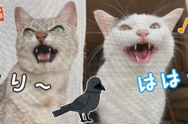 カラスを見つけて大合唱する猫2匹